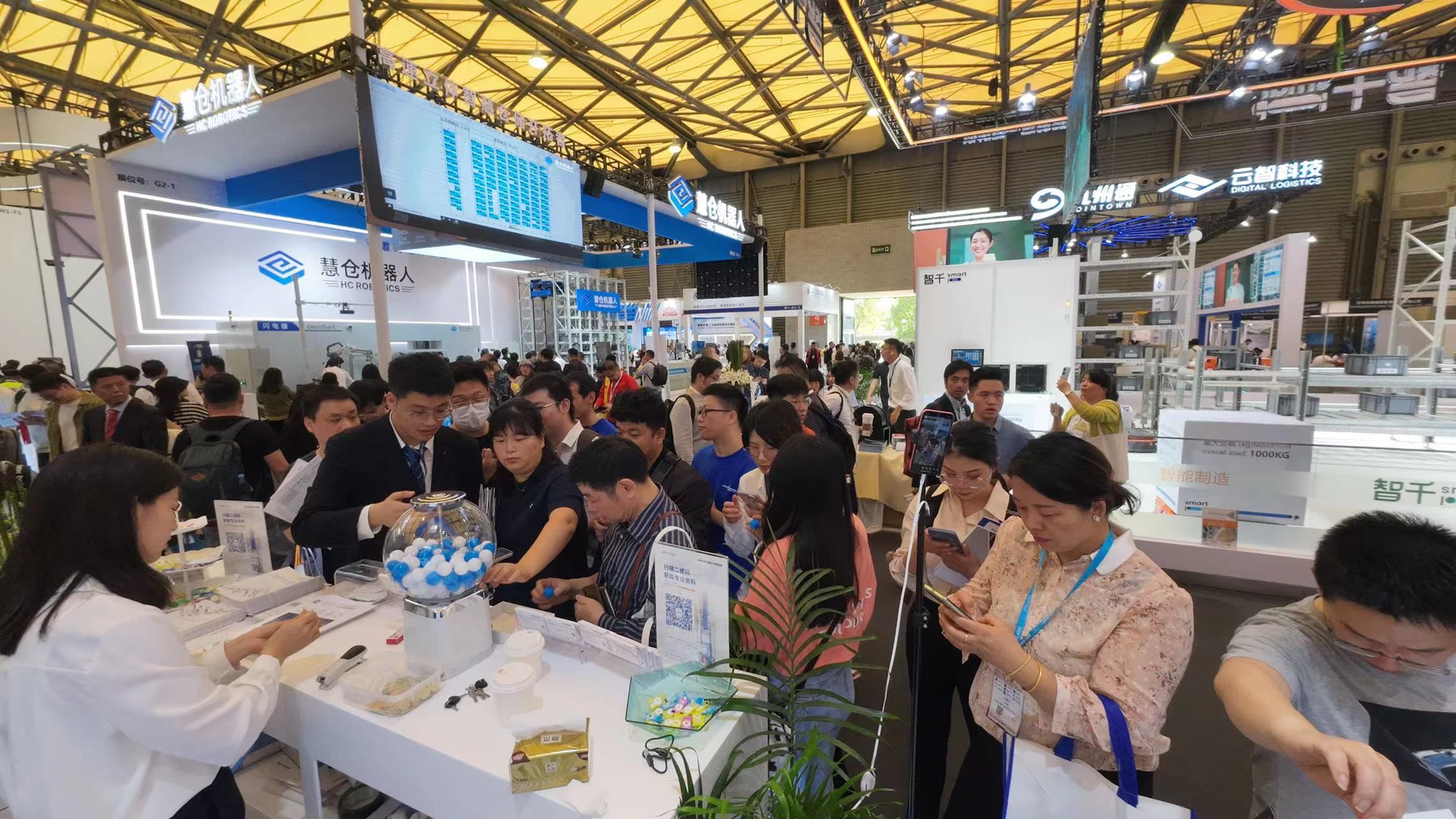在CeMAT展会现场,为了带给观众的最佳观众体验,304am永利智能设置了多个数智交互区域。