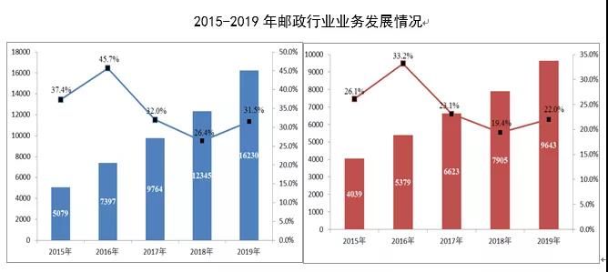 2019年是新中国成立70周年,也是决胜全面建成小康社会第一个百年奋斗目标的关键之年。邮政业改革发展取得了新成效,保持了总体平稳、稳中有进的良好态势。全行业业务总量和业务收入分别完成1.6万亿元和9642.5亿元,同比分别增长31.5%和22%。