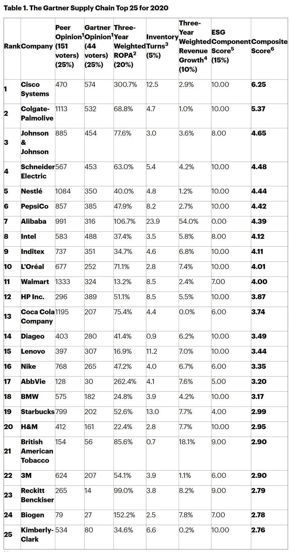 调研机构Gartner公布“2020年度全球供应链25强”榜单(The Gartner Supply Chain Top 25 for 2020)。位居榜首的是思科,紧随其后的是高露洁-棕榄、强生、施耐德电气和雀巢。两家中国企业阿里巴巴和联想上榜,分别位居第七和第十五位。六家新上榜公司为联想、艾伯维、英美烟草、利洁时、渤健和金佰利。亚马逊(Amazon)、苹果(Apple)、宝洁(P&G)、麦当劳(McDonald)和联合利华(Unilever)今年仍处在“大师”(Masters)级行列。