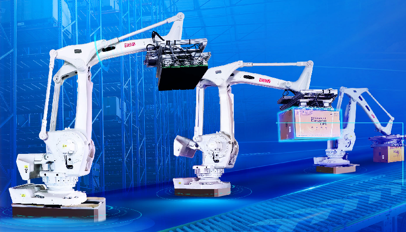 “靠着雷霆万钧之臂,将繁重的码垛压力一肩扛起”,产品到达分支线上,实现仓内高效码垛的强大支撑——关节机器人就亮相了。它可以配合3D与2D视觉实现场景实时定位,而多种算法的控制,也保障了动作起落间的自主避障。在关节机器人的运作下,产品被安全放至对应托盘,完成码垛。