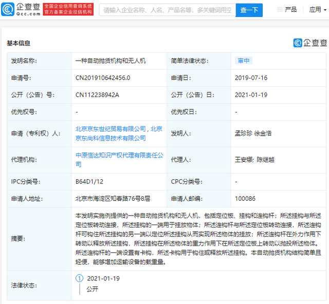 1月19日,北京京东世纪贸易有限公司公开了“一种自动抛货机构和无人机”专利,申请号CN201910642456.0,申请日期为2019年7月16日。