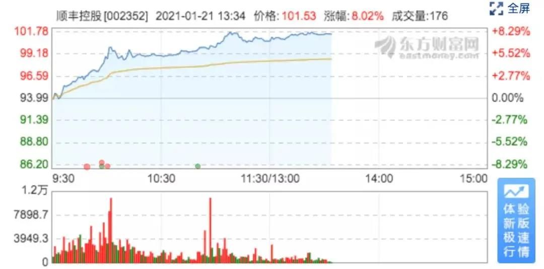 1月21日上午,顺丰控股持续上涨,股价首度站上百元大关,市值超4500亿元。